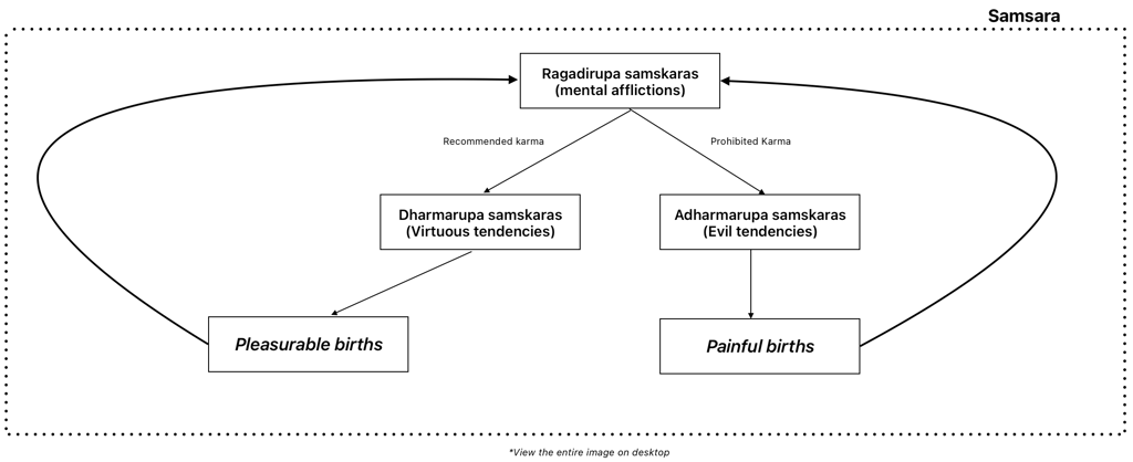 Whether one engages in good karma or bad karma, the result is the same: rebirth. After each birth, one accumulates more karmas, which continue to feed the afflictions, resulting in a cycle of favorable and unfavorable rebirths—over and over. Thus, samsara remains uninterrupted.